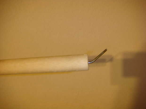 Luego tomar su aguja alicates y corta un trozo de alambre de la percha y pegamento abajo en el agujero con por lo menos una pulgada del alambre que sobresale del extremo del agujero.