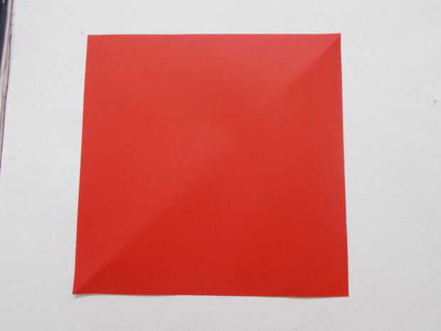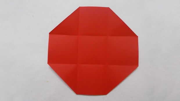 Doblar hacia adentro las cuatro esquinas (la mitad de los triángulos de la esquina) y cortarlos con una regla y un cortador para conseguir un papel en forma de octágono como esta.