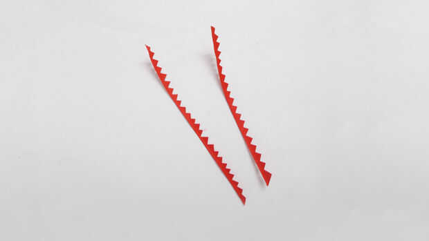 Cortar tiras de zig-zag de forma traingular y pegarlos como el borde de la bolsa de papel.