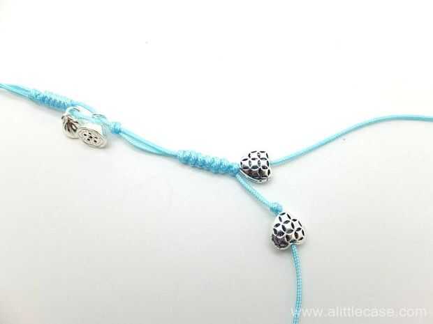 Paso 10: Continuar trenzado pulsera con nudo de serpiente, y entonces, hilo de rosca de la plata dos huecos amor granos en forma de corazón en él.