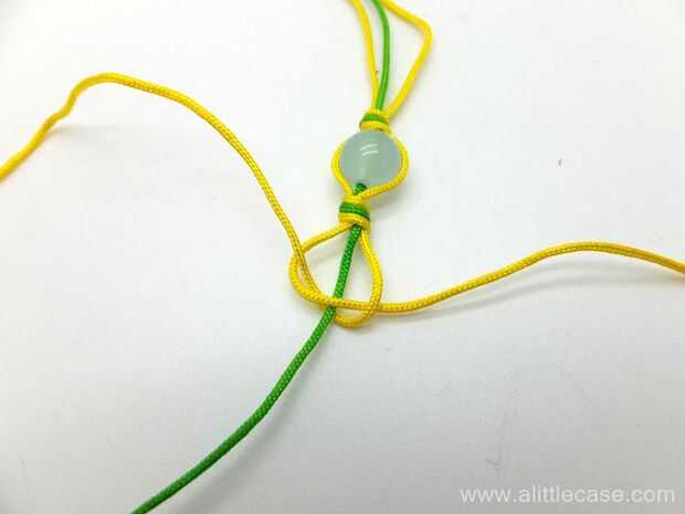Comienzo a la pulsera de un lado de la trenza utilizando el nudo plano. Parada del trenzado cuando la longitud es aproximadamente la mitad de la circunferencia de tu dedo. Luego recortar los cables amarillo exceso y quemar la cola.