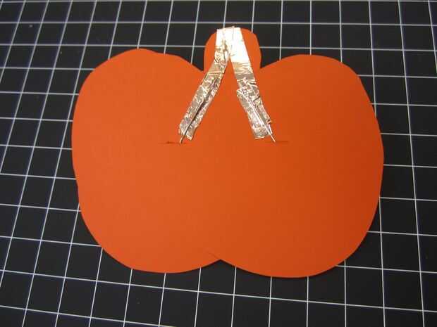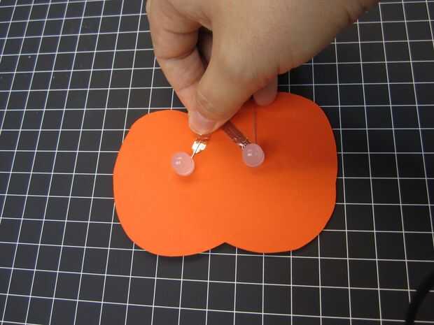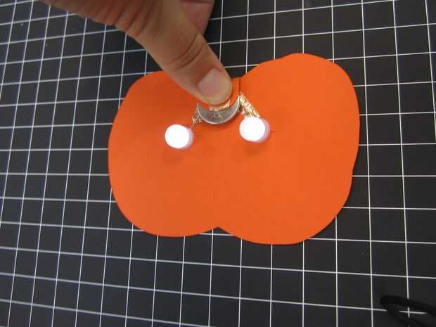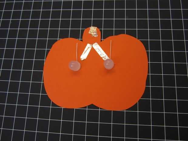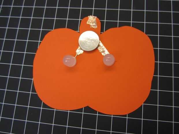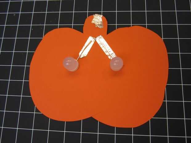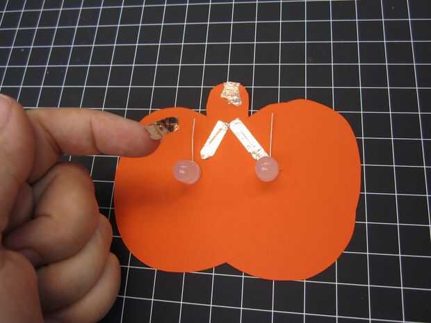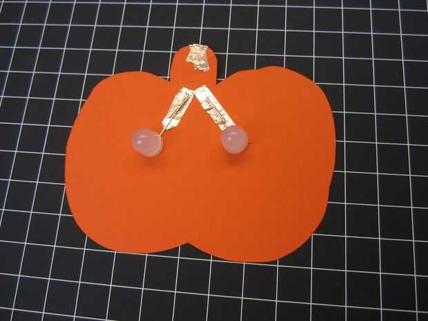 En el frente de tu Jack-O-Lantern Coloque una tira de cinta de cobre conductora diagonal de cada LED hacia la pestaña de la batería naranja como se muestra. No extienda la cinta la ficha. Funcionará mejor si las dos tiras de cinta están tocando en el centro.