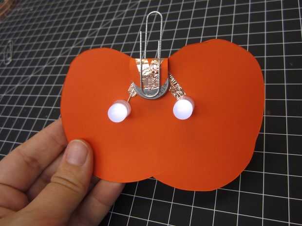 - Uno de su LED es al revés. Despegue la cinta de las patas del LED y del interruptor que se inserta a través del papel.