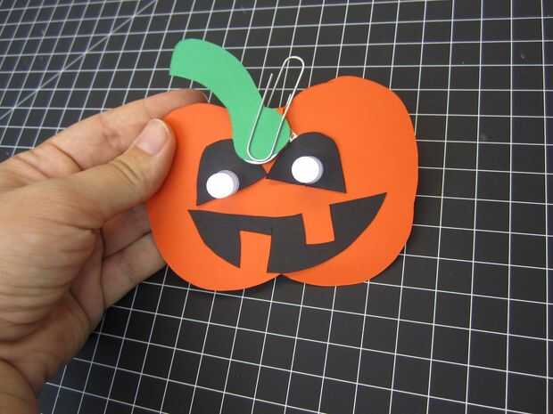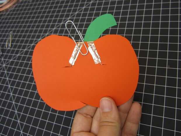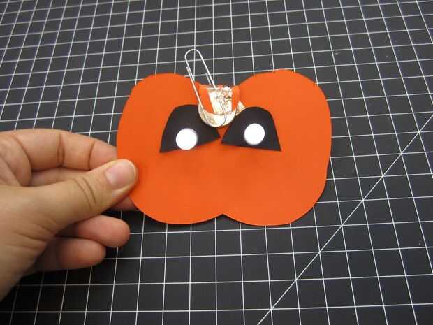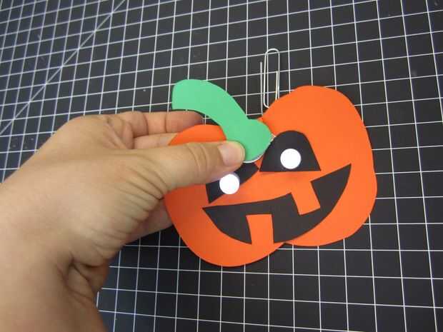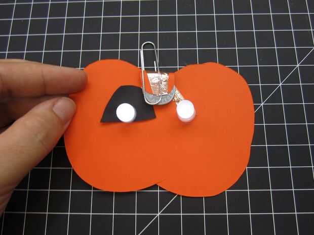 Corte el tallo en papel de construcción verde. El extremo redondo del tallo irá bajo el clip, que cubre las tiras de cinta conductora de la parte posterior de la Jack-o-Lantern. Asegure el tallo con cinta adhesiva o un palo de pegamento si quieres.