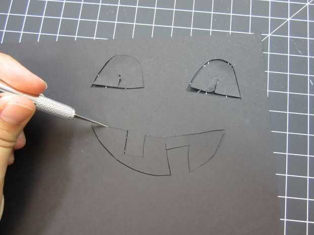 Recortar la boca a mano alzada, tal vez con las muescas de los dientes. Pegamento o cinta adhesiva sobre la Jack-o-Lantern.