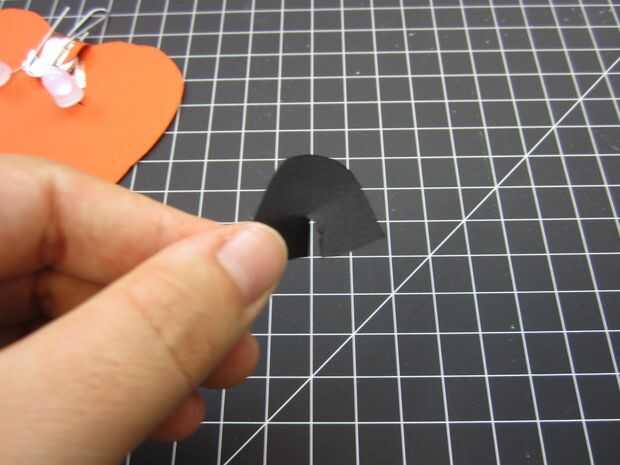 Corte los ojos de cartulina negra. Corte una raja a medio camino encima del ojo. Deslice el ojo bajo el LED como se muestra, con las piernas llevadas por la raja. Gire el ojo por lo que es vertical.