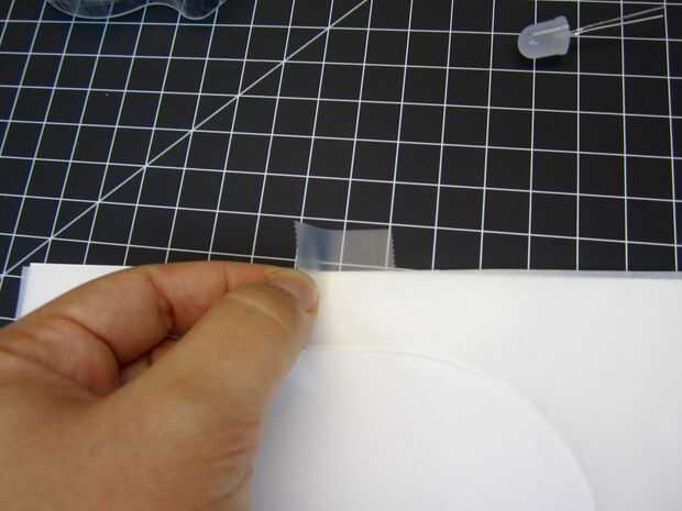 A continuación encontrar tu LED y dobla las piernas 90 grados a la cabeza de LED. Colóquelas en el papel aproximadamente donde quieras los ojos fantasma gruñón. Corte una pequeña raja en el papel directamente debajo de los LEDs. Pegar ambas patas del LED a través del papel por lo que son en la parte posterior.