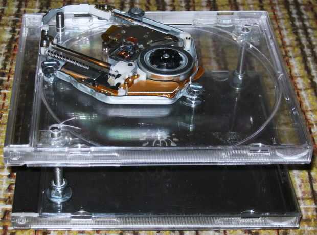 Muy bien, así que quería ser capaz de girar mi laser Cruz. Así que tenía un viejo reproductor de CD de música que había recuperado las piezas aprovechables para las piezas pero todavía tenía el mecanismo de CD. Os adjunto a la cubierta superior de caja de CD para que el CD iba sobre el centro. Tenía tres monturas de goma había perforado unos agujeros para tornillos de cabeza plana de 6/32 y adjunta a la parte superior. Si usted quiere hacer algo parecido luego improvisar.