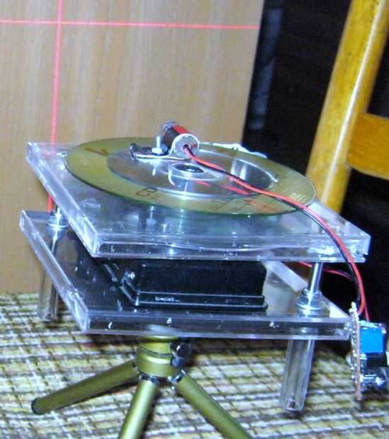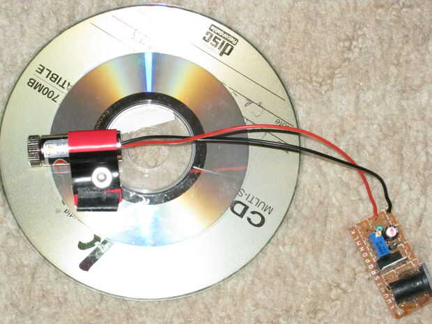 OK, aquí es mi láser funky. Tomé una tira de aluminio de un letrero "Se vende" de aluminio y había doblada alrededor de mi láser en una especie de forma de 'P'. Taladré un agujero de 9/64" en este soporte para que cuando se utilizan un 6-32 tornillo y tuerca se pinza hacia abajo en la caja del láser. Taladré un agujero de 9/64" en el mini-CD para que sea sobre el láser a través del centro del CD. También utilicé una herramienta rotatoria (Dremel clon) para abrir el orificio de montaje. Luego, utilizando un tornillo de cabeza plana corta por debajo del mini-CD, os adjunto el láser. (ver fotos)