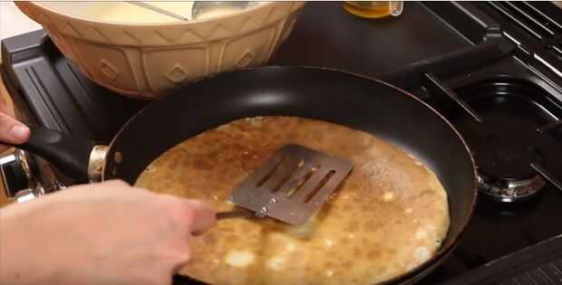 Coloque la sartén en el calor y espere hasta que los bordes comienzan a encresparse y el centro de la muestra grandes burbujas – esto toma cerca de 40 – 60 segundos. Luego agite la sartén un poco para ver si el panqueque viene floja. Si no utiliza un cuchillo rebanar o boca para aflojar los bordes, luego voltea la tortilla usando una rebanada. (O puedes probar les tirando!) Freír el otro lado de la tortilla en la temperatura alta durante unos 30 segundos, luego deslice la crepe en un plato a enfriar.