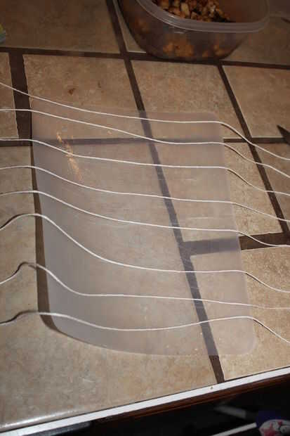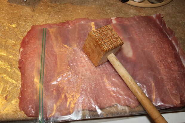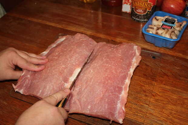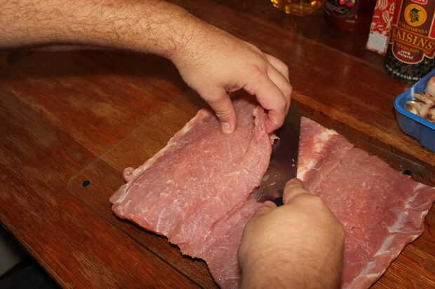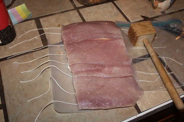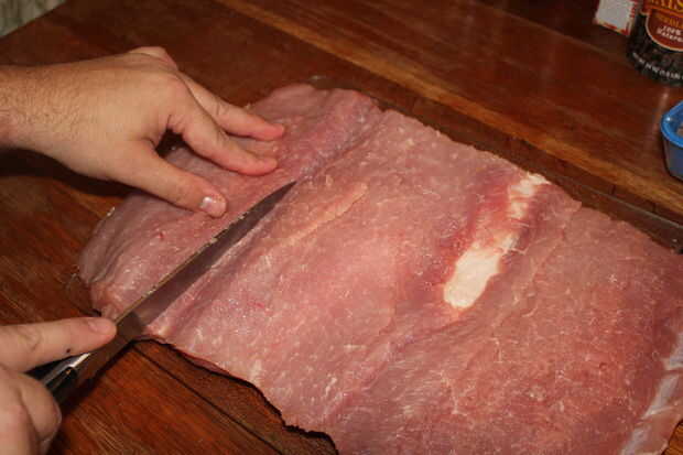 para facilitar las cosas por sí mismo, una vez que la carne cortado y golpeado, colocar el hilo por debajo de la carne antes de comenzar a añadir la mezcla de relleno.