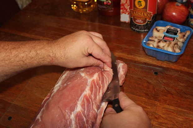 Vierta el relleno en la carne y atar para arriba.