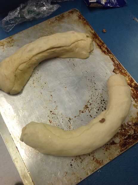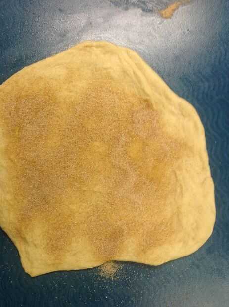 Dividir la masa en 2 secciones dejan reposar durante 10 minutos mezclar azúcar y canela. Enrolle el rectángulo de masa into12x8 pulgadas. Cepille ligeramente la masa con mantequilla derretida. Espolvorear la mitad del azúcar y la canela. Coloque suavemente las manzanas, nueces y azúcar en la masa. Colocar en molde ligeramente engrasado. Cubrir, deje reposar durante la noche en el refrigerador.