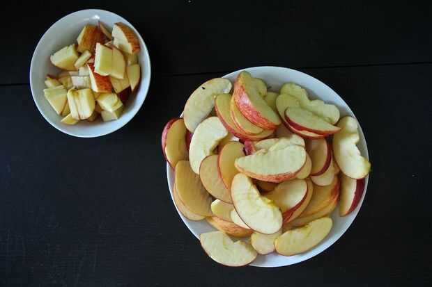 Después de que hayas hecho esto, cortan tus manzanas. Salvó una manzana y cortar en cubos porque ésos en la masa derramé más adelante mientras que usé las rodajas para cubrir la torta.