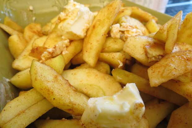 Espolvoree un par de cucharadas más o menos de azúcar sobre éstas. Debe exprimir medio limón sobre ellos para obtener el azúcar comenzó. También, añadir algunos canela, cepillo una pizca de sal sobre ellos, añadir algunos canela y media barra de mantequilla.