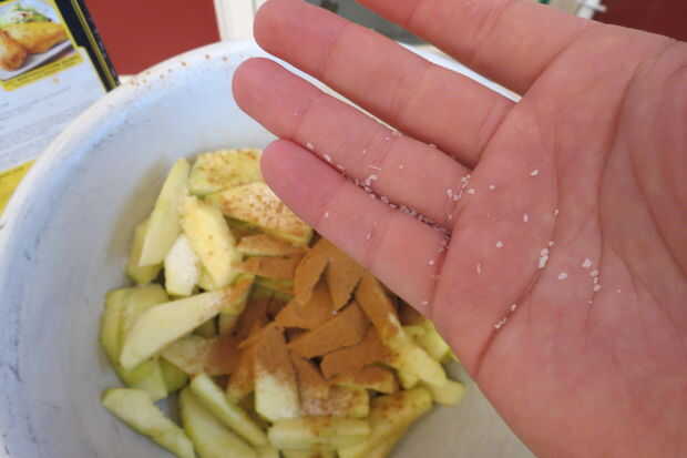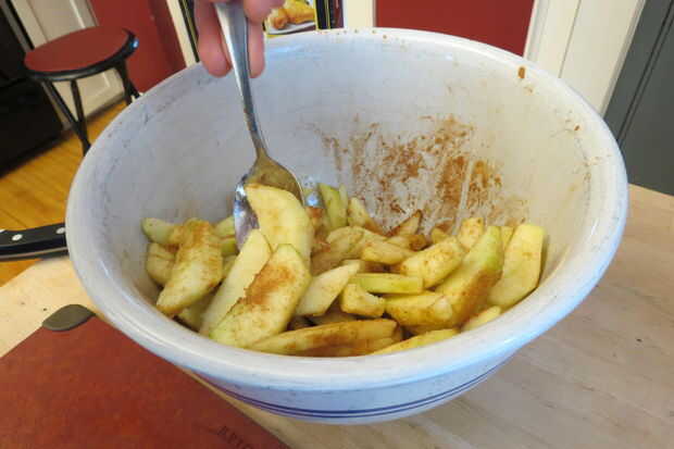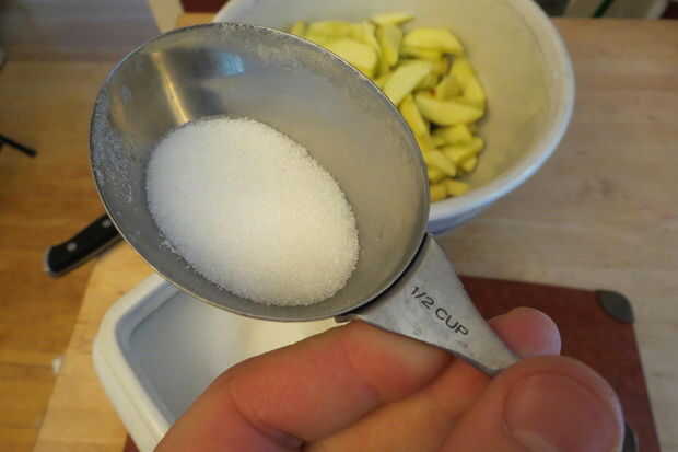 Mezcle las manzanas alrededor y dejar que el azúcar haga su cosa-pelar el jugo de las manzanas, mientras sigues la página siguiente. Esto les impide ser blandos y es un paso crítico.