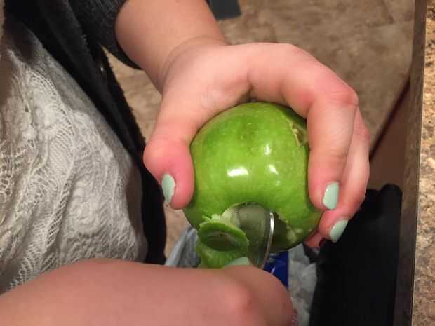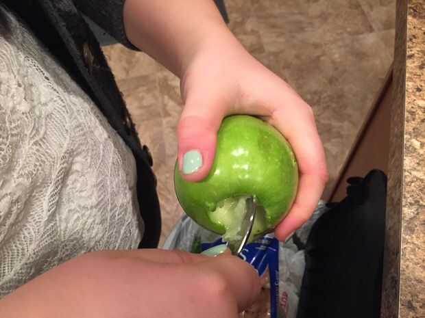 Ahora tenemos que crear espacio para el relleno. Sólo utilizamos una cuchara pero se puede utilizar una herramienta de perforación si tienes uno. Usando una bola de movimiento giratorio hacia fuera el centro de la manzana. Vaya hasta que hayas hecho una cavidad de tamaño decente y eliminado de la base.