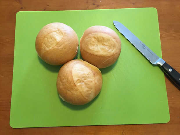 Usted notará en mis fotos que tengo dos tablas de cortar de diferentes colores. Verde utilizo para panes, frutas y verduras y otros artículos frescos. El rojo se que utilizo para carne cruda solamente. A pesar de que finalmente se mezclarán los ingredientes con la carne cruda es siempre una buena idea separar las tablas de corte y lo último la carne cruda. Los menos casos de salmonella mejor digo!