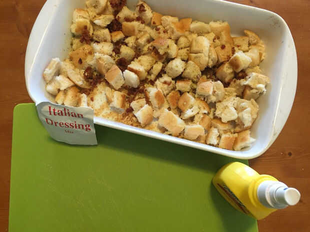 Cortar rollos duro 1/2" o pedazos más pequeños. Mezcle con pedacitos de tocino en un 9 "x 12" para hornear pan. Rociar las piezas de pan generosamente con aceite de oliva o aceite vegetal (puede ser sacudido con 2 Tbs derritió mantequilla si no tienes una botella de spray de aceite). Espolvorea la mezcla seca de preparación sobre el pan y tocino.