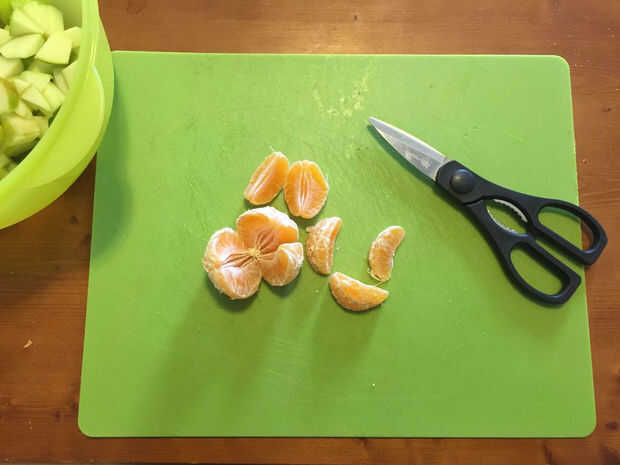 Pelar las Satsumas (o naranja) y separar en secciones. Utilizando unas tijeras de cocina, cortar en pequeños trozos en el bol para mezclar.
