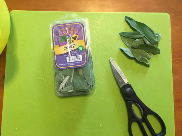 Hojas de salvia Lave y retire los tallos. Pila y snip corta las tiras a través de las hojas con unas tijeras de cocina en el bol para mezclar.