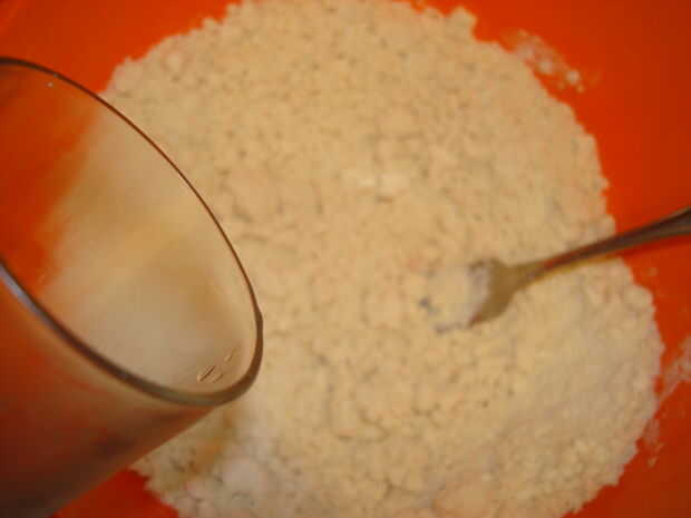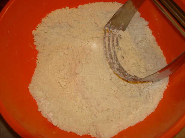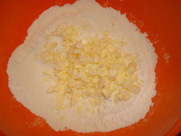 • Luego agregue la mantequilla en cubos y mezcle hasta que la mezcla se asemeja a la harina gruesa.