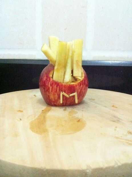 A diferencia de papa, aquí se utiliza apple para hacer papas fritas, cáscara de manzana utilizando el pelador y cortar rectángulo de apple que tienen la forma de papas fritas, selección de diente de uso para conectar las papas fritas en el stand de apple.