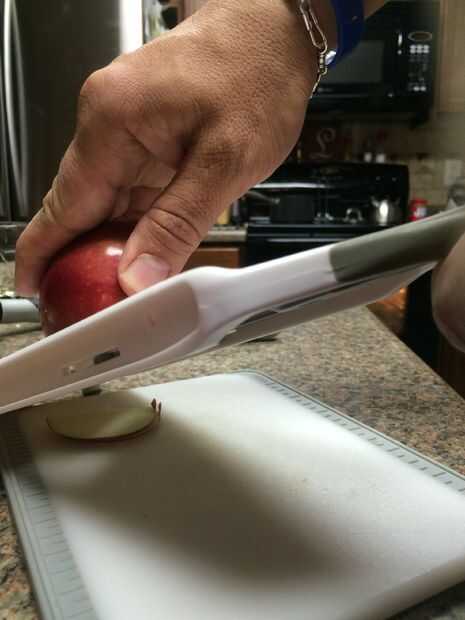 a continuación cortar un extremo poco para que quede uniformemente en la mandolina. Luego corte en trozos delgados.