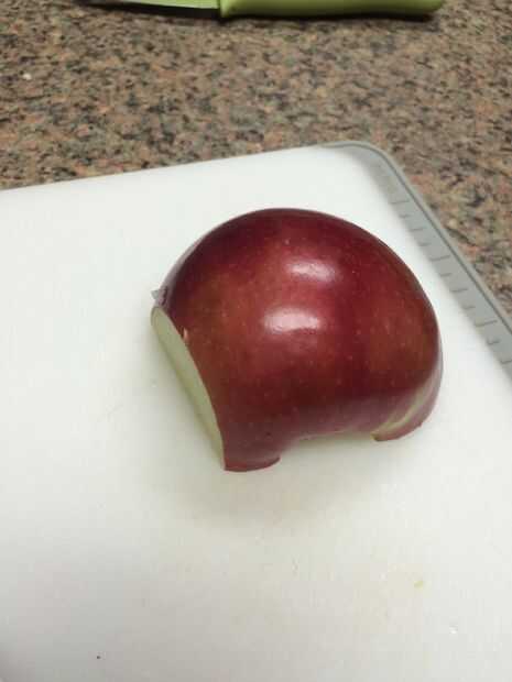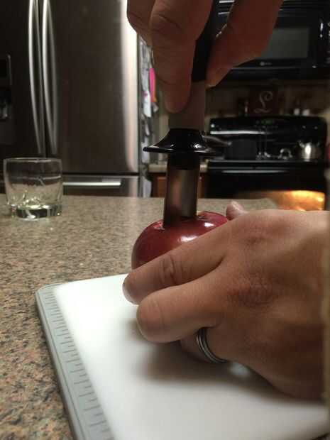 Base de la manzana y cortar por la mitad. O puede cortar por la mitad y utilice el cuchillo para quitar la sección de base.