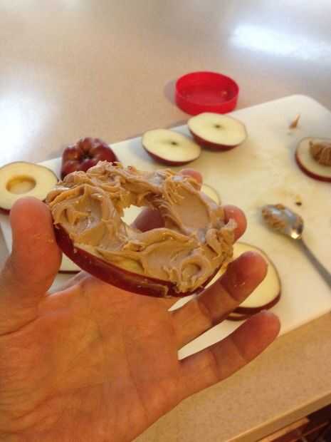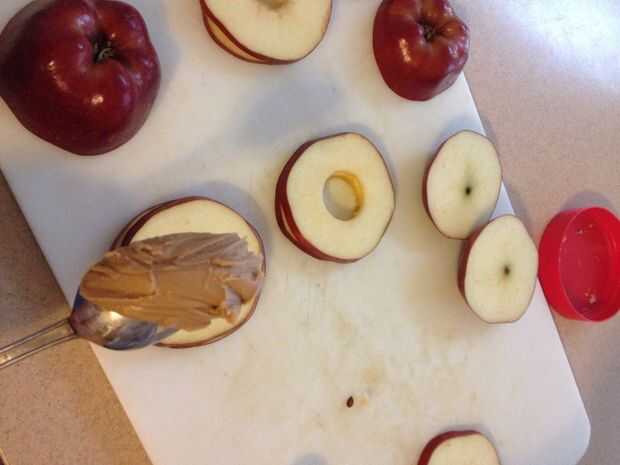 Una vez que tuvimos las láminas base, extendemos mantequilla de maní en el segmento inferior del "sándwich". Hacerlo poco a poco la mantequilla de maní no se pega bien a las rodajas de manzana.