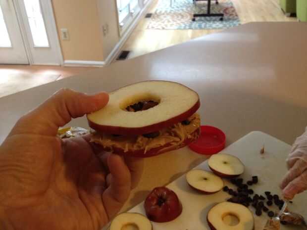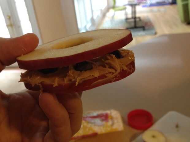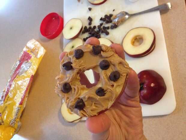 Ponemos un aro de trocitos de chocolate encima de la mantequilla de maní y había rematado el sándwich con la otra rebanada de manzana, y voila - yummy, pseudo-sano bocado (más saludables con mantequilla de maní natural todos sin azúcar añadido). Disfrutar.