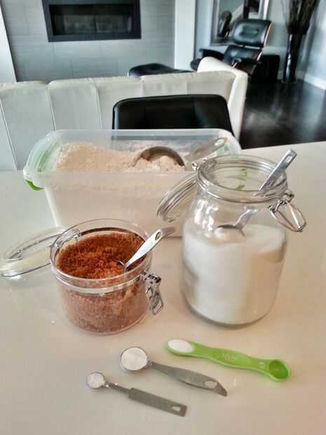 Paso 2: En un recipiente, mezclar la harina, azúcar marrón y blanco, polvo de hornear, bicarbonato de sodio y la sal.