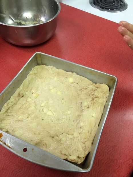 Combine en un tazón mezclador grande 1½ tazas de harina, levadura, azúcar, sal y canela; mezclar bien. En una cacerola, calentar agua y manteca hasta muy caliente (120° - 130° F; hace acortamiento no es necesario derretir). Añadir a la mezcla de harina. Añadir el huevo. Mezcla a velocidad baja hasta humedecer; batir 3 minutos a velocidad media. Con la mano, poco a poco Agregue las manzanas, las nueces y la harina restante para hacer una masa suave. Extender masa en tubo enmantecado o pan de torta cuadrada de 9 pulgadas.