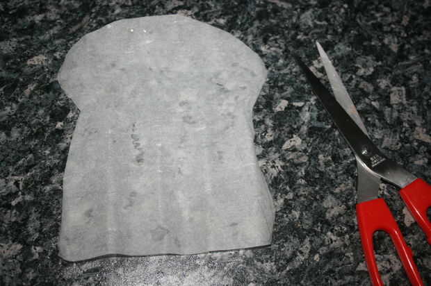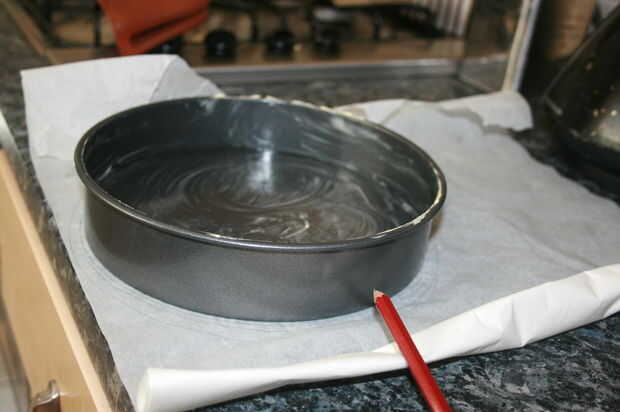 Usando el círculo de papel parafinado de paso tres corte una forma de pan. Hacer un poco más pequeño que el círculo que trazaste así que usted puede cortar los bordes claros.