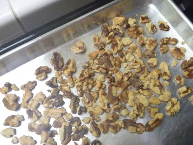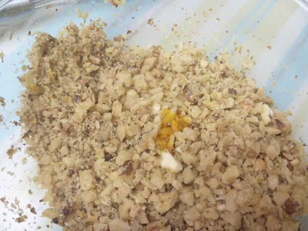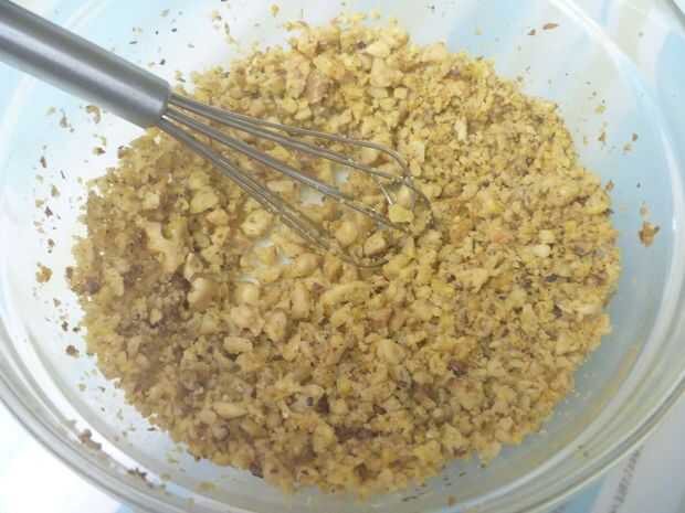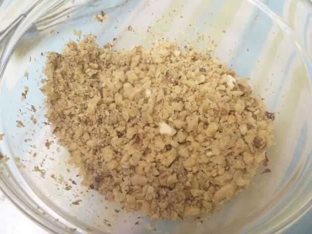 Nueces tostadas/nueces en una sartén seca a fuego medio, o en la parrilla hasta que estén doradas. Dejar de lado que se enfríe. Una vez frío, picar o usar un procesador de alimentos nueces finamente. Añadir de 8 a 12 gotas de colorante amarillo, si lo desea.