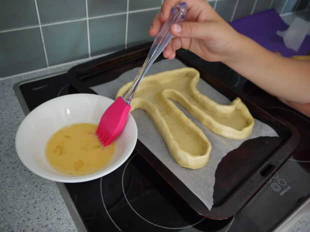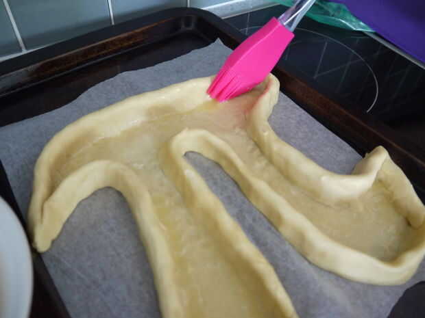 7. bate un huevo hasta que se mezcla y luego con un pincel de repostería, los bordes y se une a la capa como se muestra en la imagen (8) y (9)