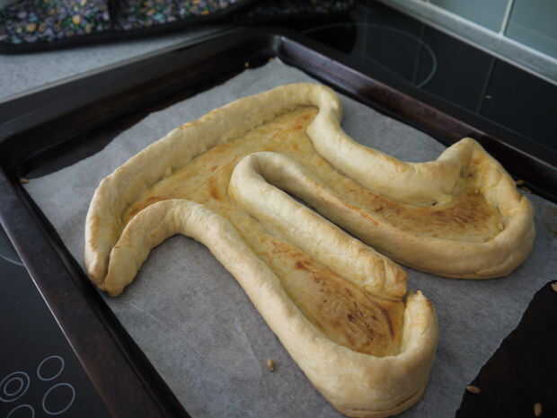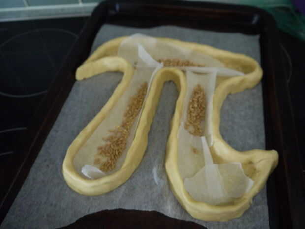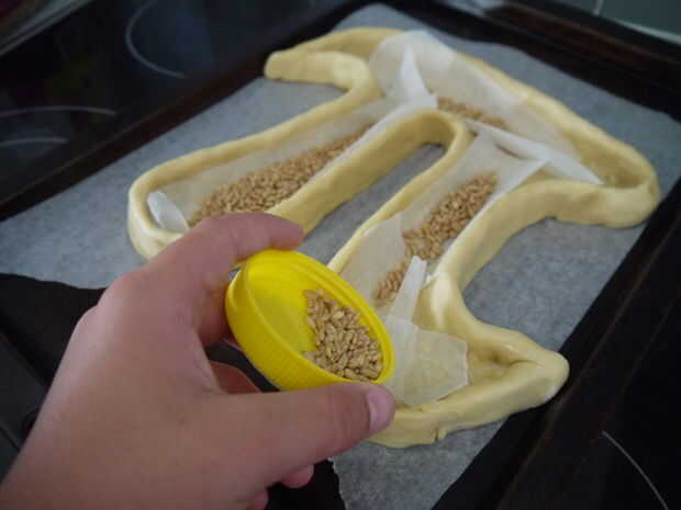 8. el interior de la masa con papel de hornear tanto como puede y luego trigo que ayudan a que la masa mantenga su forma, la línea