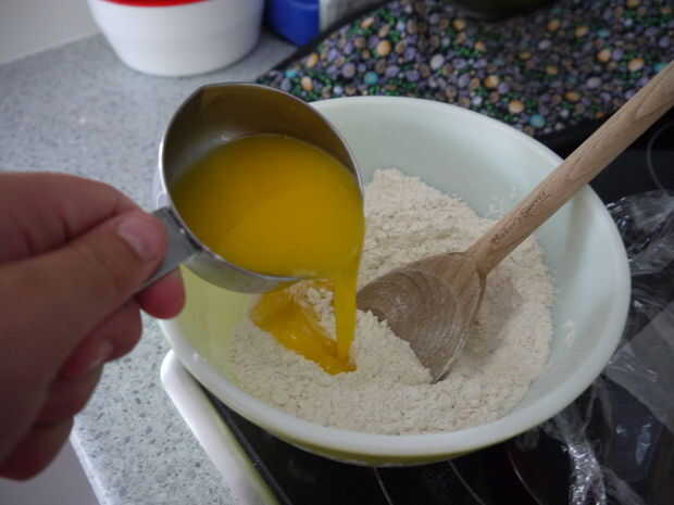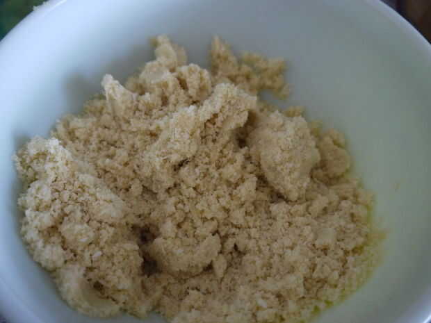 1. mezclar la mantequilla, azúcar, coco y harina en un recipiente como se muestra en la imagen (1)