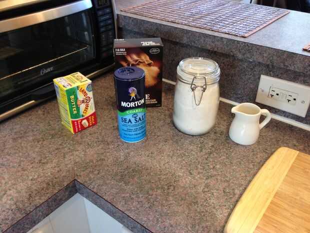 Paso 1: Organizar los ingredientes y ponerlos a un lado, algo que recomendaría es tomar sólo lo necesario y ponerlo en un plato pequeño. Por ejemplo... en lugar de tener un gran saco de harina, tomar su 3cups y ponerla en un tazón pequeño para no perder espacio en el mostrador.