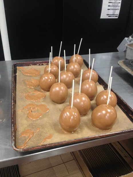 a. sumergir una manzana en el caramelo, dejar gotear ~ 6 en el caramelo hasta cintas y globos grandes dejan de caerse.