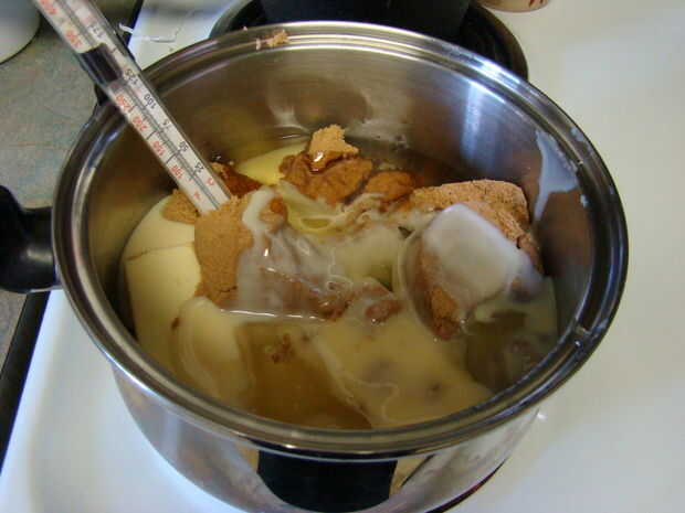 leche condensada azucarada y jarabe de maíz en la sartén.