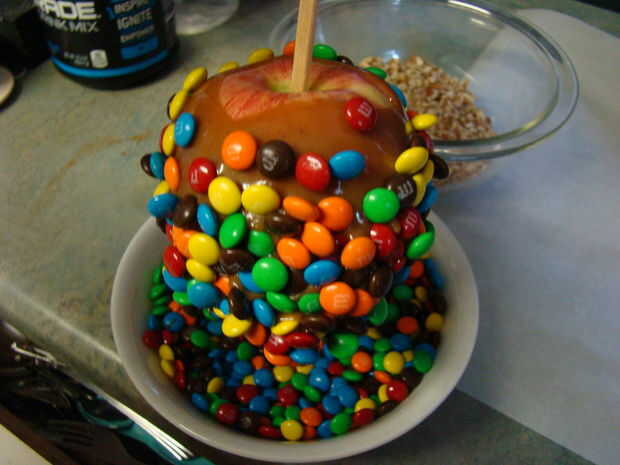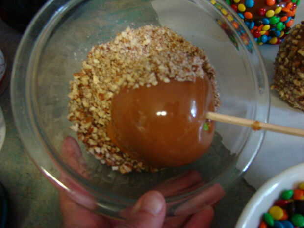 Sumerja rápidamente la manzana caramelo cubierta en las dulces o nueces, girando y presionando para que el material se pega al caramelo. Colocar la manzana acabada en el papel de pergamino.