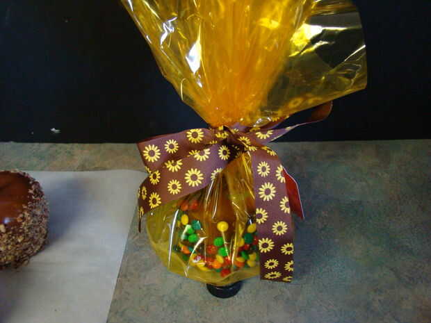 Para envolver una manzana de caramelo como regalo, me dejó un pedazo de papel de pergamino en la parte inferior de la manzana y envolver en papel celofán y atar una cinta alrededor de la palanca. Se ve realmente bien.