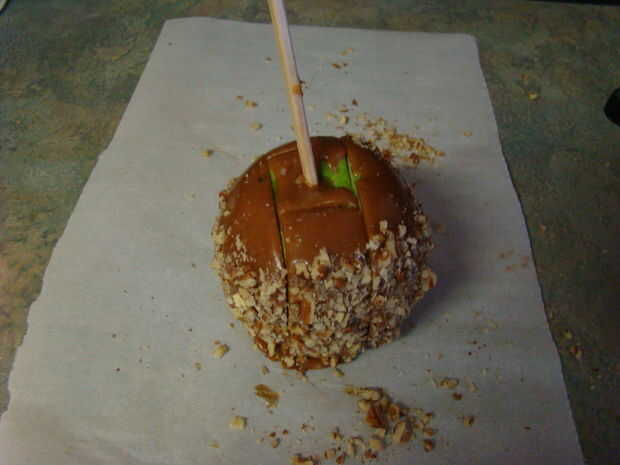 Aquí es una manera sencilla de servir a una manzana de caramelo. Con un cuchillo afilado chefs, rebanada a lo largo de un lado de la puntada, luego cortar en el lado opuesto. Por último corte los dos extremos. Ahora la manzana caramelizada es más fácil para comer y compartir. ¡ Disfrute!
