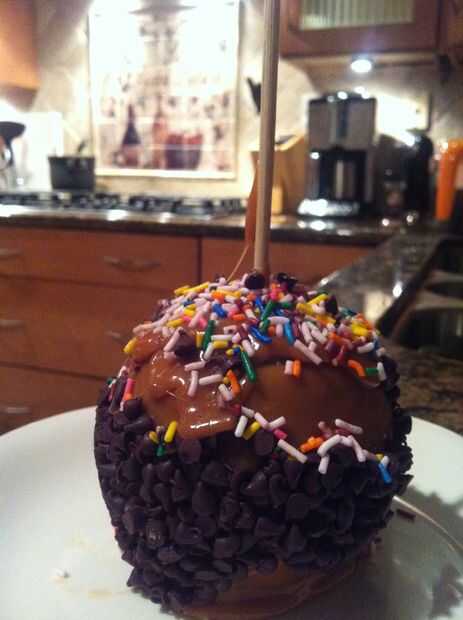El último paso es agregar aderezos! Mientras que el caramelo se está secando se debe aplicar cualquier cobertura que no es chocolate derretido. Si desea cubrir la manzana de chocolate, espere a que el caramelo se seque y rocía el chocolate sobre la manzana de caramelo. Espere a que el dulce de leche o cualquier otro relleno se seque antes de comer. ¡ Disfrute!
