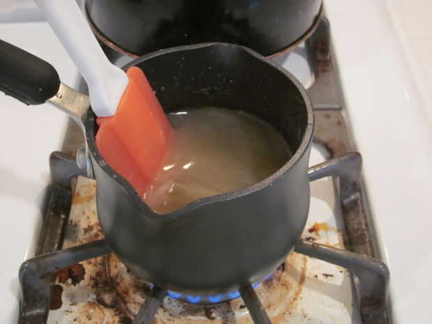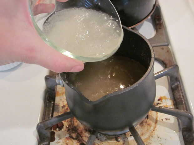 Añadir la gelatina disuelta en agua a la mezcla de puré en la cacerola.