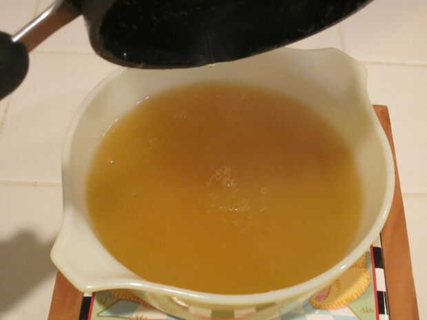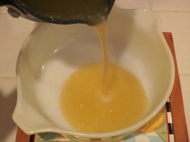 Retire la mezcla de la estufa y vierta en el recipiente resistente al calor que engrasado antes.