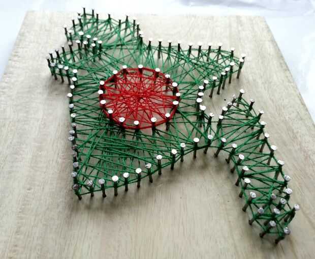 Proyecto de tesis estado cadena arte son divertidos de hacer y verse bien. básicamente clavo su frontera utilicé mi estado Wisconsin. Luego le clavo una estrella donde el capital es y cadena hilo hacia adelante y hacia atrás entre la estrella y la fr