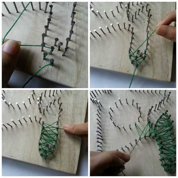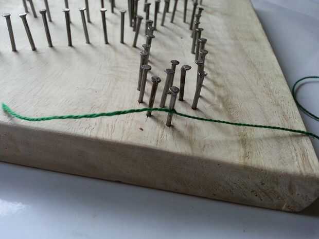 Elija un punto de partida. Tomar el hilo y enróllelo alrededor de cualquier clavo un nudo.