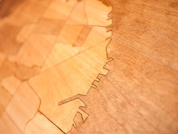 este mapa madera de San Francisco está todo hecho de una sola pieza de madera contrachapada y muestra todos los barrios de la ciudad gracias a diferentes tipos de tinta para madera.